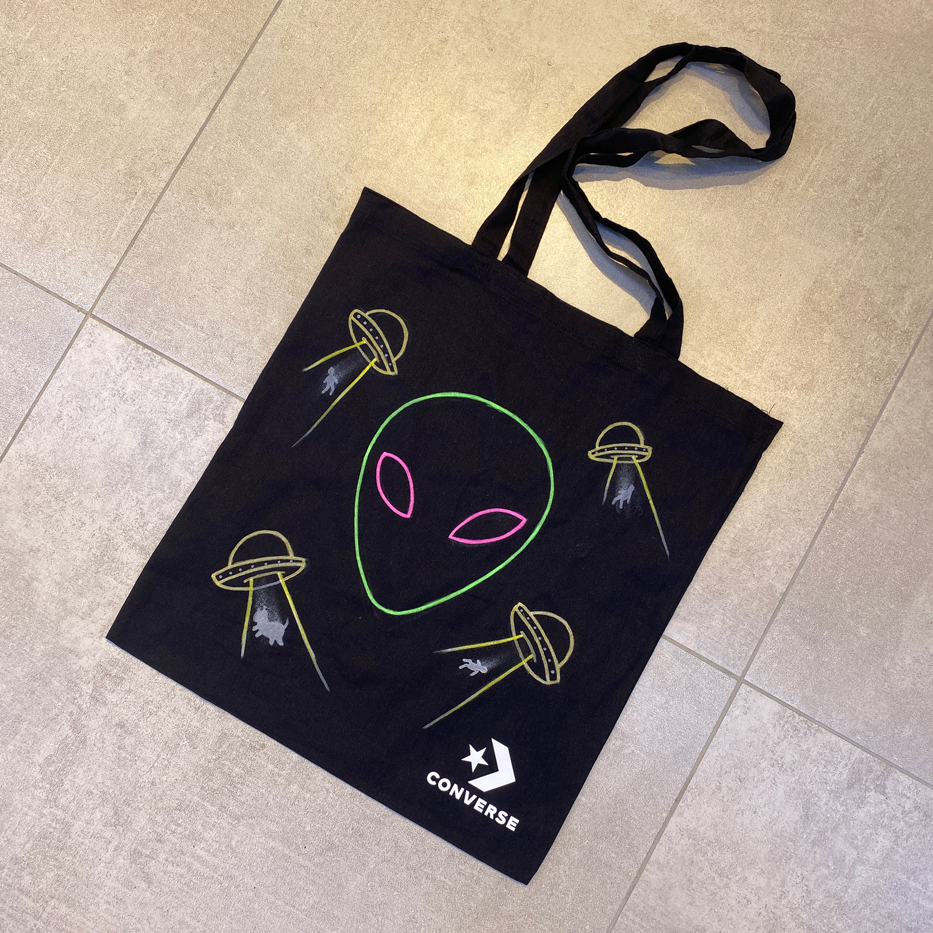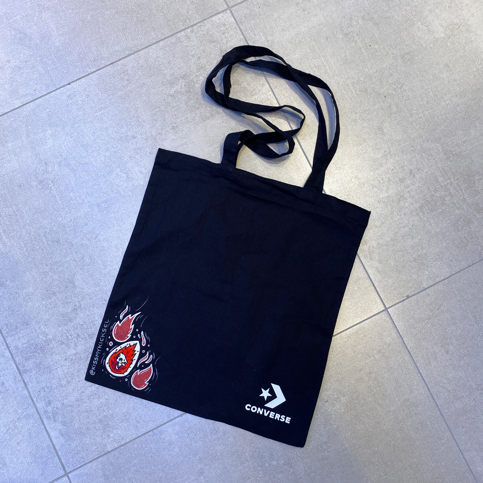 Activación realizada para la inauguración de la nueva tienda THE LINE en Mall Plaza Vespucio. Realizamos diferentes diseños en totebags para que la gente que comprara un par de Converse se llevara de regalo una bolsa.